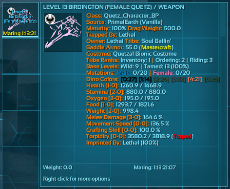 你应该将这个模组视为“Obby+”。这个模组使用了 Obby 的数据结构,Obby 保留的一切数据——这个模组也保留了,甚至更多。这个模组只是在 Obby 功能已经存储的数据基础上增加了额外的数据保留,以提升生活质量,让你的恐龙不会在释放时处于完整的交配冷却期,或者让它们的各种行为切换配置重置,比如炮塔模式或受害者物品收集等。因此,我不会直接处理 Obby 数据结构保留的任何内容,包括但不限于:属性、印记、等级、颜色、性别或大约 3500 字节的序列化数据。